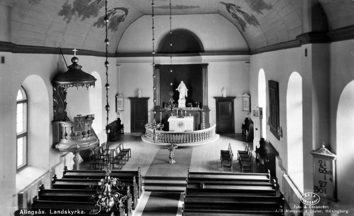 Landskyrkans altare, predikstol, altarring och en Jesusstaty.
