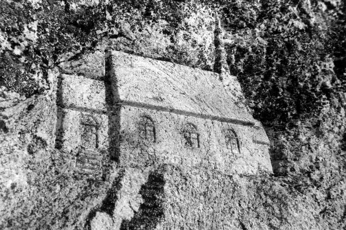 Minnesten över Hemsjö gamla kyrka. Stenen gjord av Gunnar Kärrman och visar hur kyrkan enligt uppgift en gång sett ut.