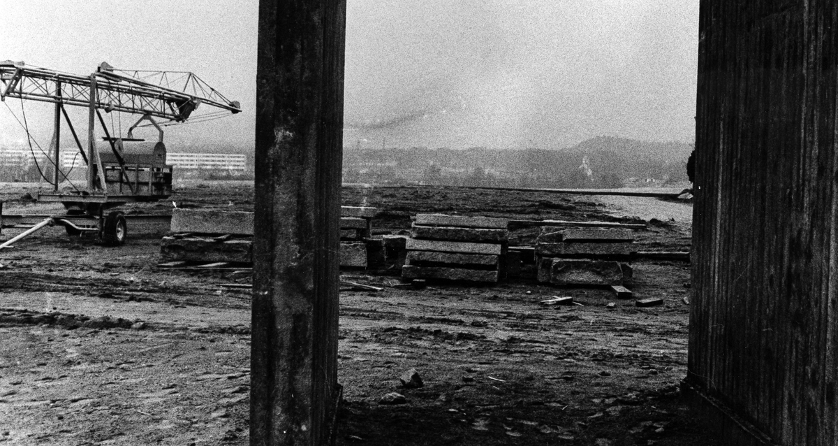 Bild från bygget av krematoriet. Upptrampad jord med högar av brädor och en lyftkran.