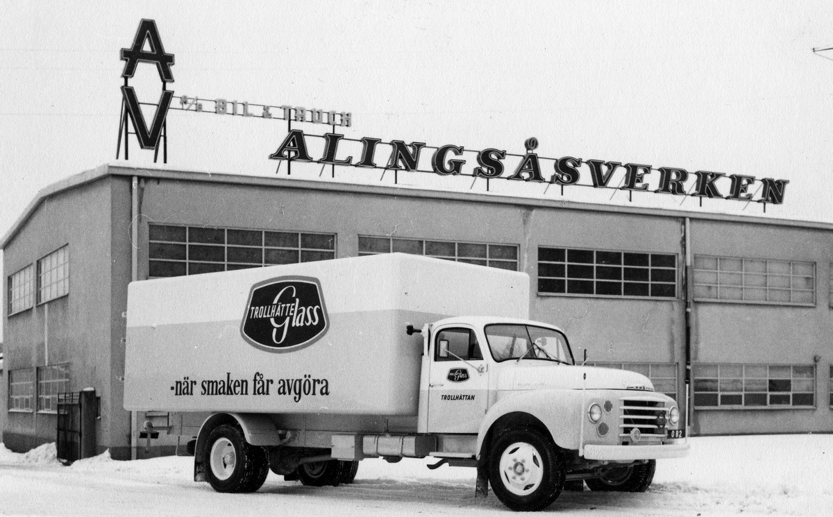 Bilden visar en lastbil tillhörande Trollhätte glass som står parkerad framför Alingsåsverken.