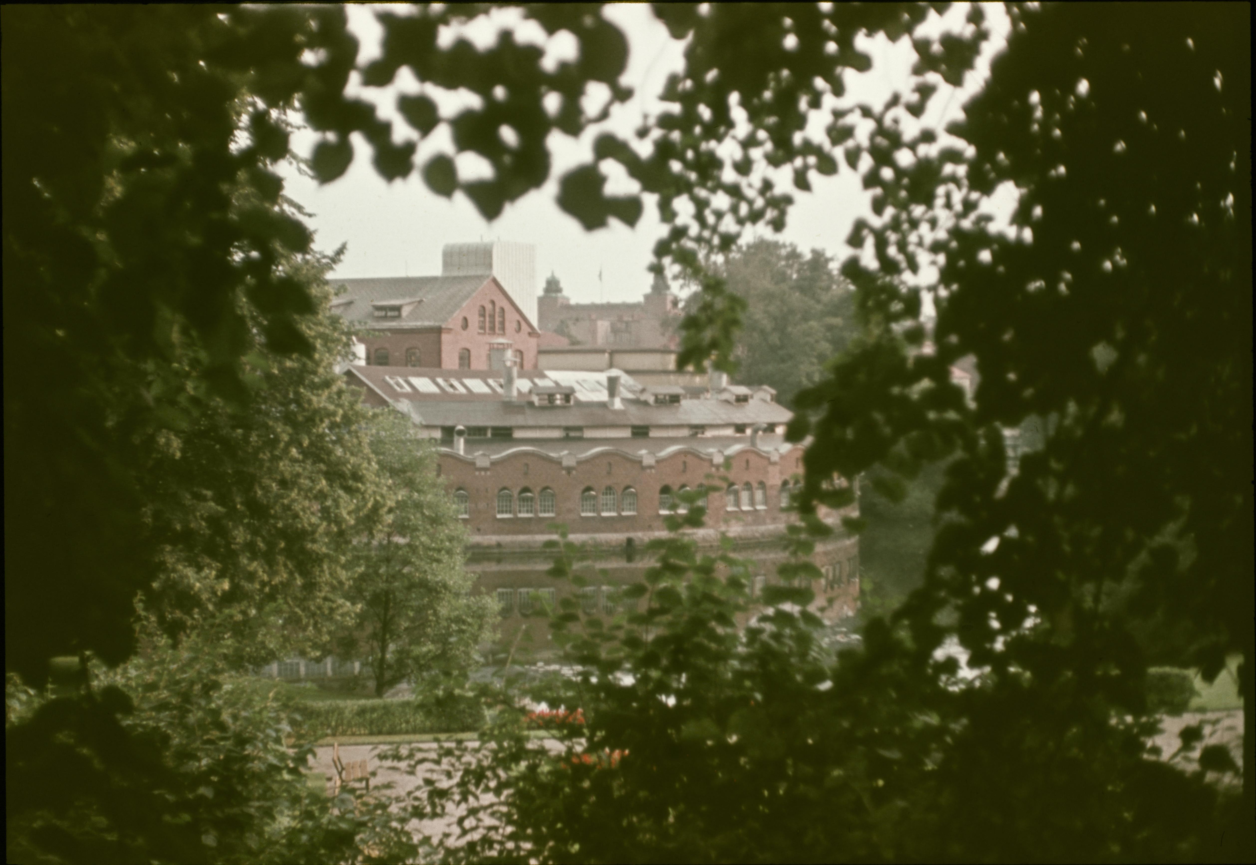 Vy österut längs kanalen i stadsparken. I bild en numera riven fabrik.