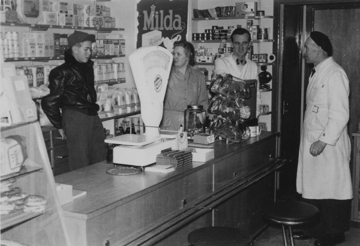 Från vänster: Ove Kjell-Svärd - Margit Kjell - Arnold Andersson - Edvin Kjell fotograferad i Kjells speceriaffär som låg i hörnet Hemvägen - Lärkvägen. På väggen bakom dom en reklamskylt för Milda.