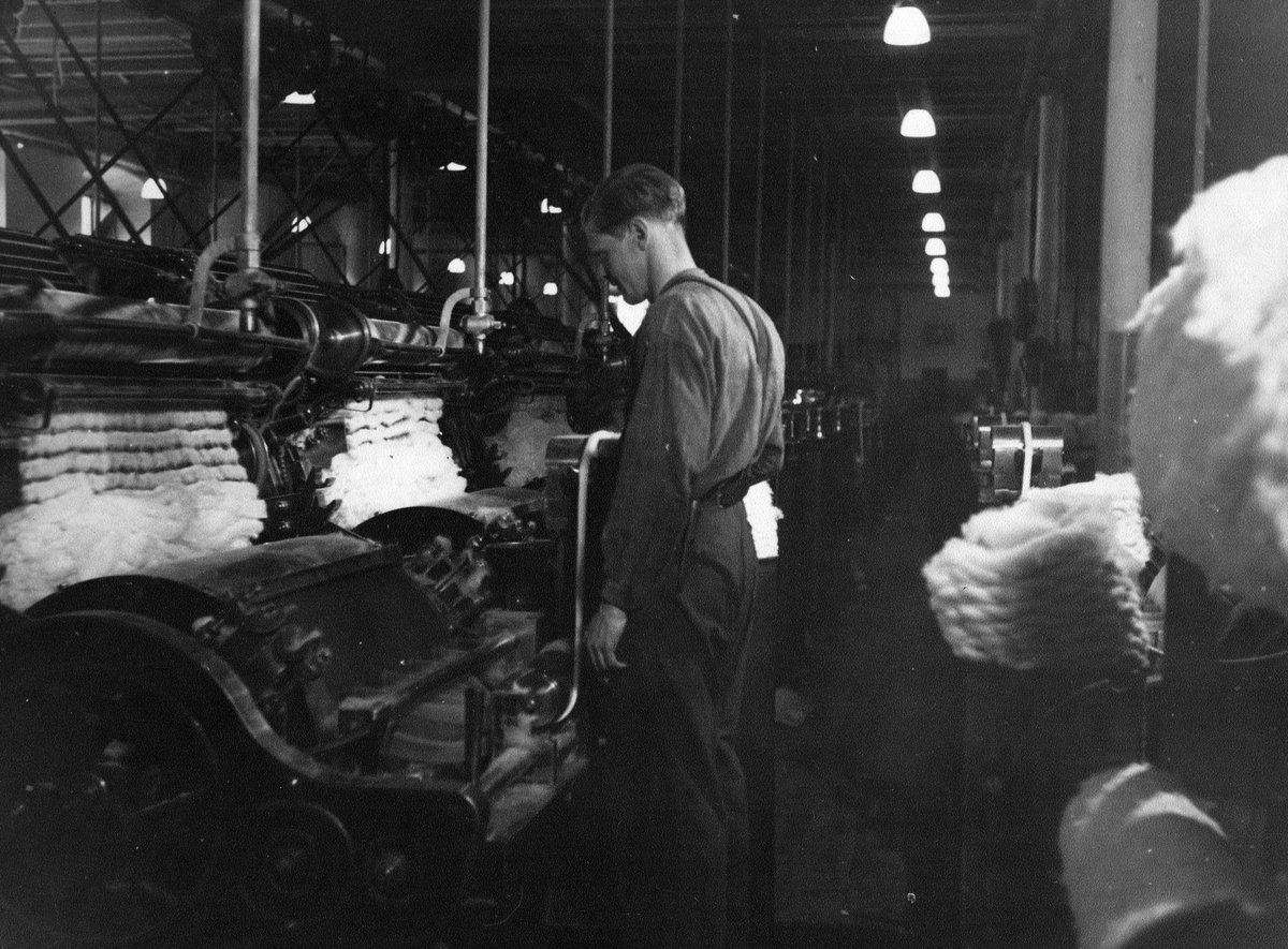 En man arbetar vid rensmaskinen för bomull. Nääs fabrik i Tollered.