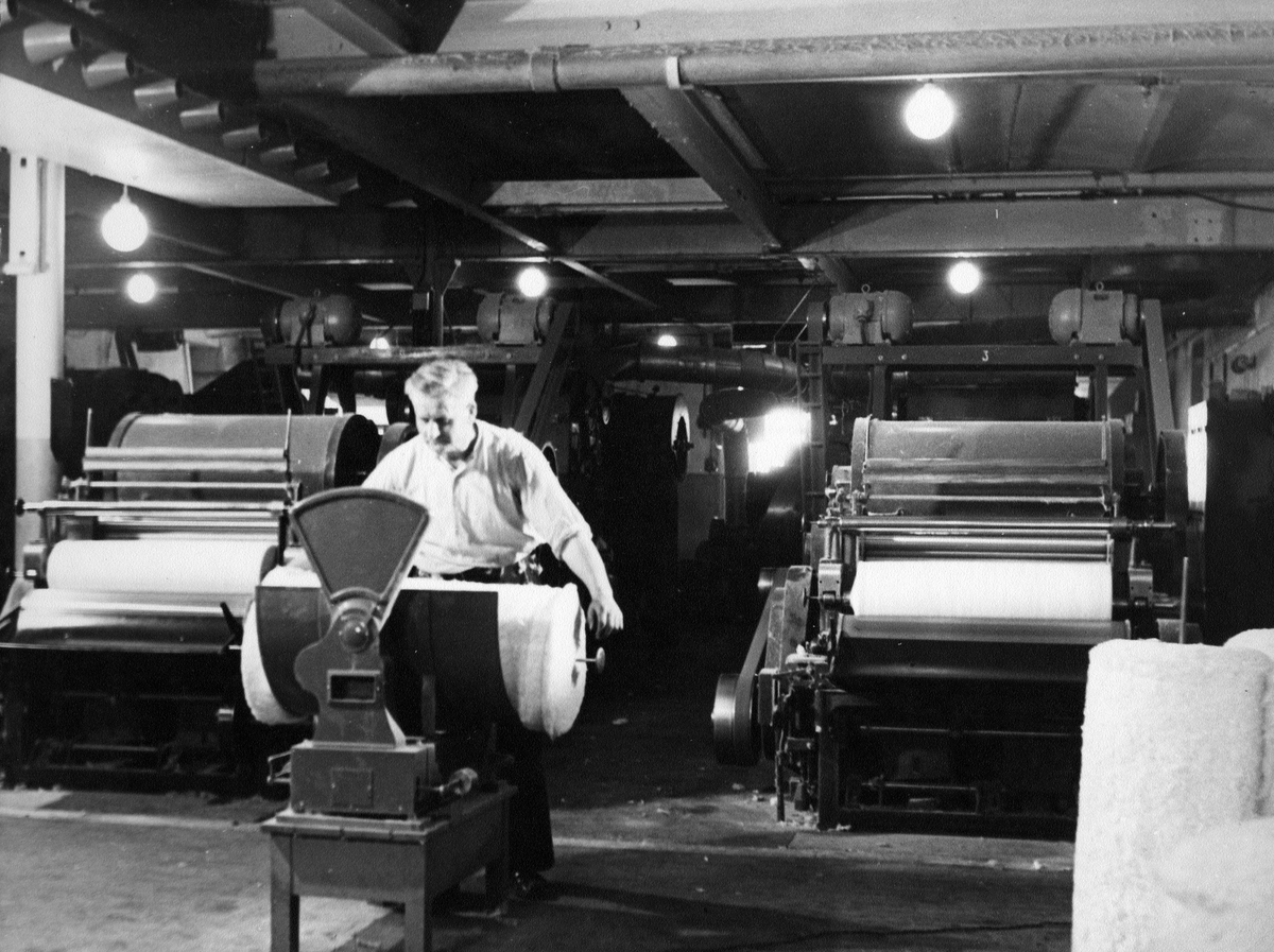 En man väger bomull efter reningsprocessen. Nääs fabrik i Tollered.