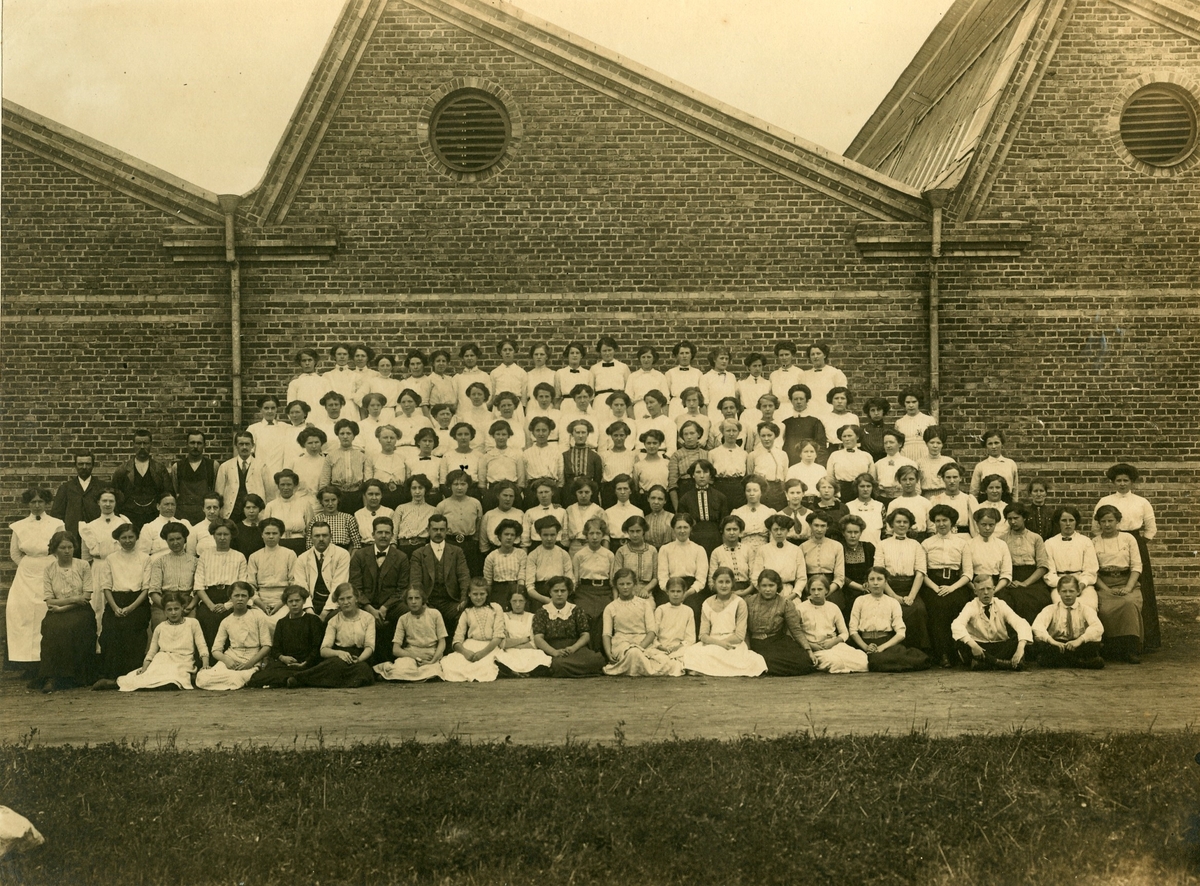 Gruppbild över ca 120 anställda på Linnefabriken i Alingsås.