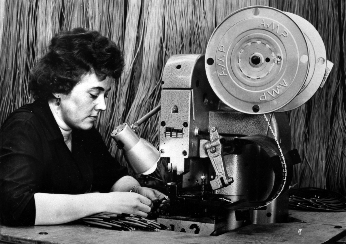 En kvinna sitter vid en maskin och tillverkar ledningsnät för SAAB-bilar.