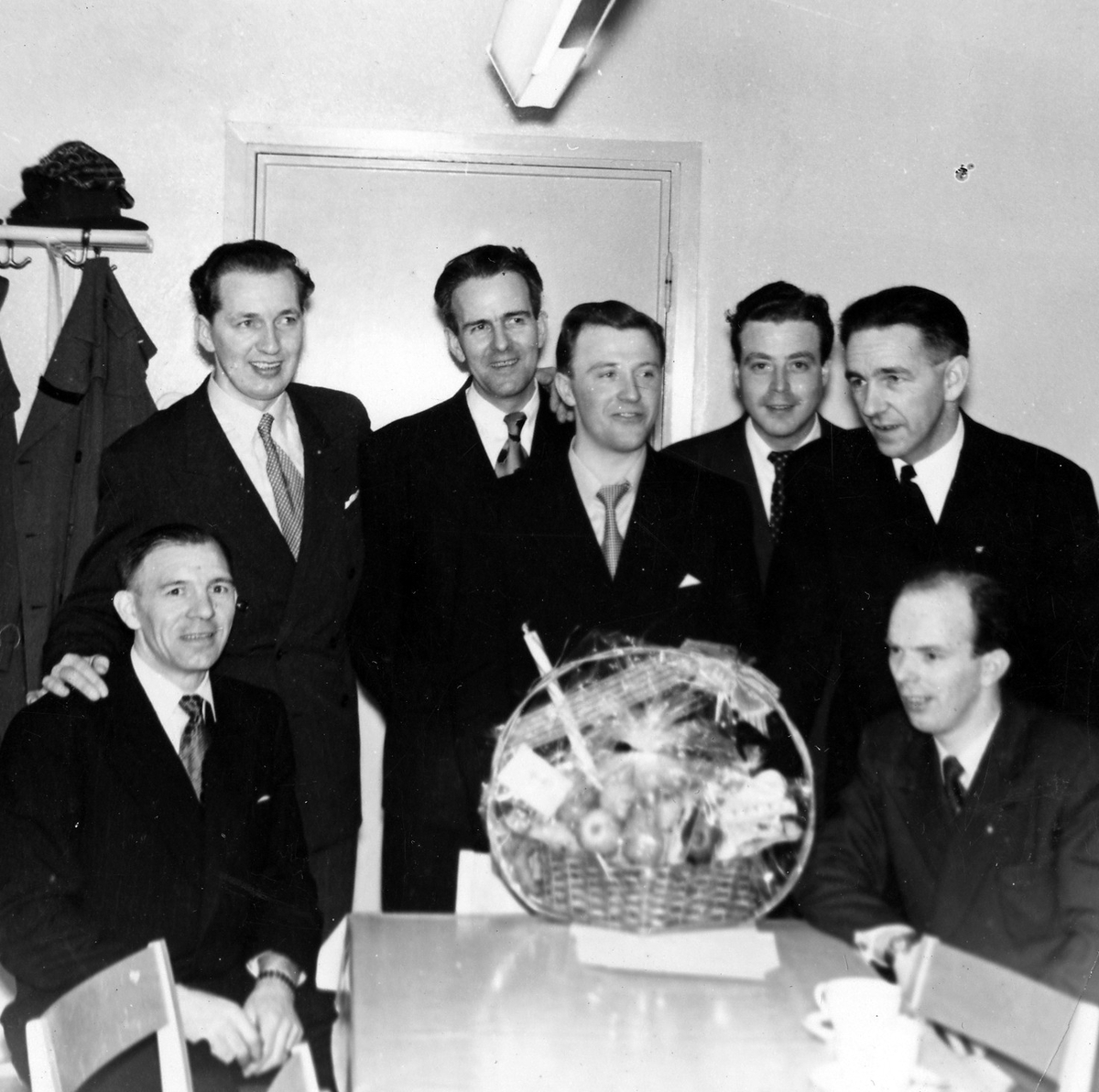 Stående från vänster: Arild Nilsson, Yngve Gustavsson (Tekaverken), Harry Karlsson (Elektro Apparat), Egon Larsson, John Bengtsson (Larsson & söner)