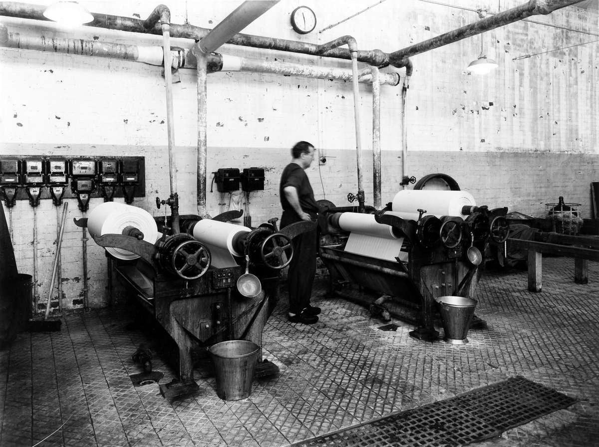 Alingsås bomullsväveri, nya fabriken vid Gerdskastrand. Man som står mellan uppradade maskiner.