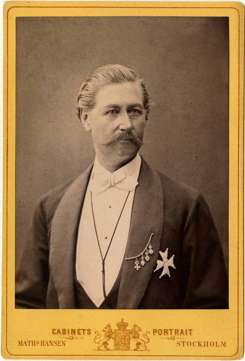 Visitkort med porträtt av Claes Adelsköld (1824-1907). På kanten står det: "CABINETS PORTRAIT MATHs HANSEN STOCKHOLM".