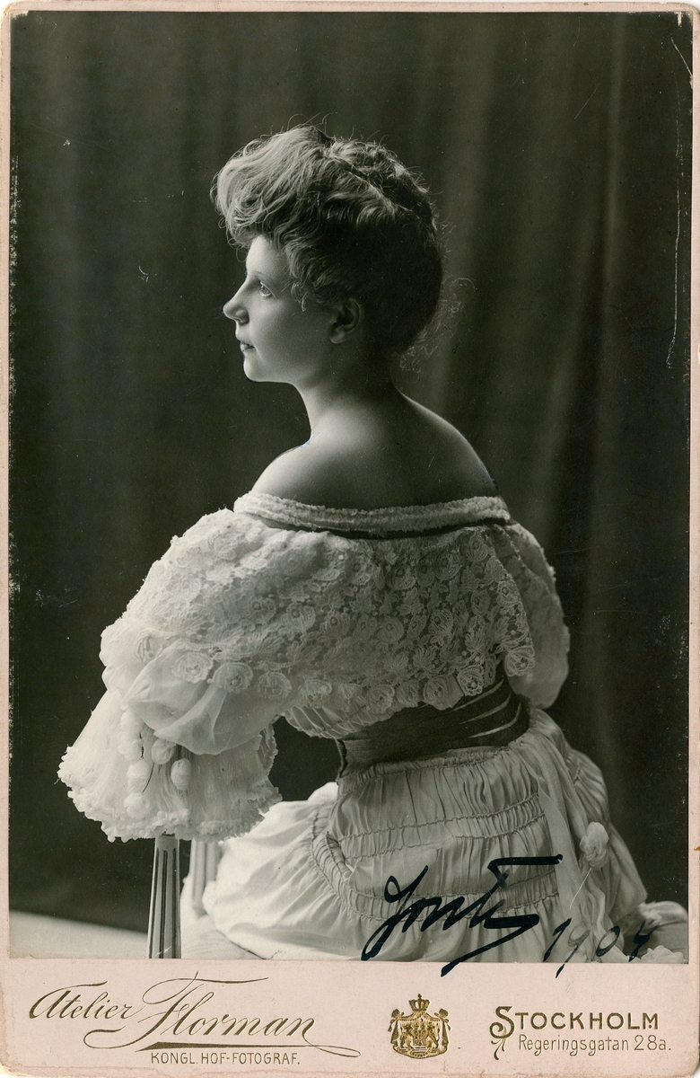 Titel: Ateljéporträtt av Bib Adelsköld. Hennes egna kommentar om bilden: "Stockholm 1900 "Amaranthen". Vitt siden, mjukt blankt guldskärp af "min brors uniformsskärp", hvita cgiffonärmar, hvit chiffonkjol med volang under klänningenm små guldskor. Tappade nästan underkjolen då jag just skulle niga för "Farfar" = kung Oscar. Jag klef ur underkjolen och tog den på armen och då spelade musiken upp: "Lotta, Lotta tappar kjolen, laga att hon inte tappar mer" - och alla sjöng!!! Så dansade vi fram till "Farfar Oscar" och öfrig Kunglighet, stannade och bockade och neg. Det var i Grand Hotells fästvåning. Bib Adelsköld 18 år. Detta foto togs när jag satt mellan tagningarna. Då jag såg copian till detta profkort köpte jag plåten och slog sönder den."