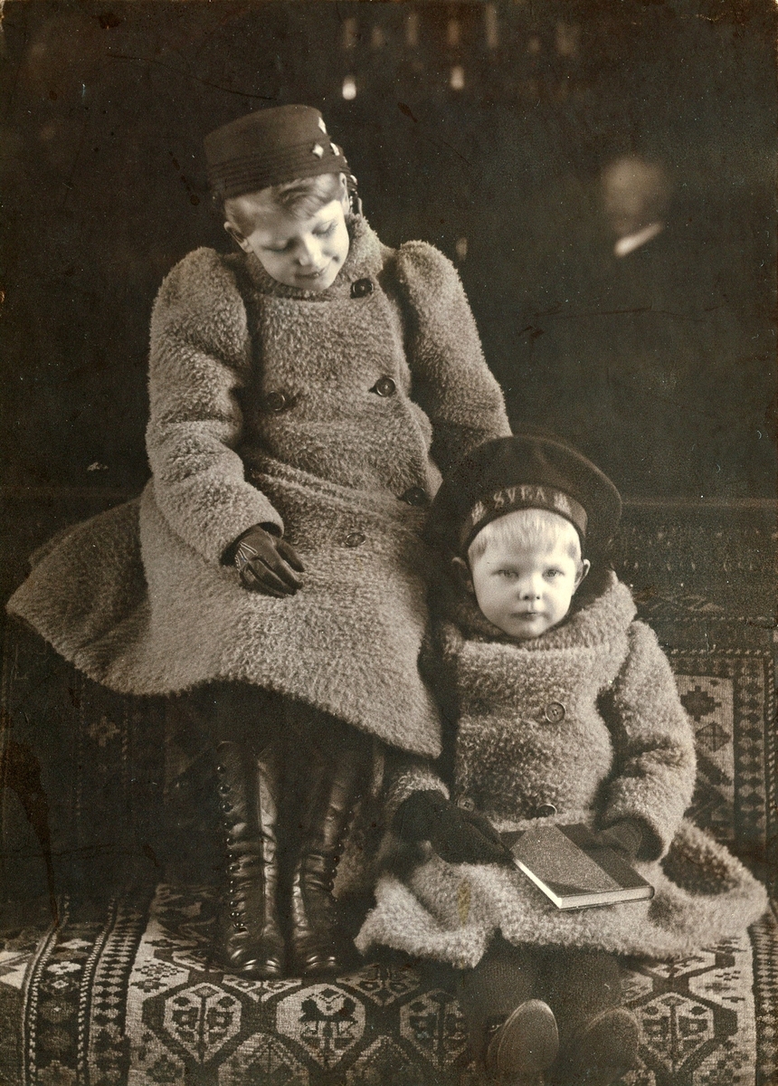 Porträtt av två barn i vinterkläder. På baksidan har Bib Adelsköld skrivit: "Bib 5 1/2 år Älskade Raoul 2 år, 11 månader i vår vinterträdgård på Villagatan 2 (Sthlm) i vår Villa. Alla Blommor ute på landet ännu. Pappa Putte syn's i spegeln. Jag älskar Dom. Bib"