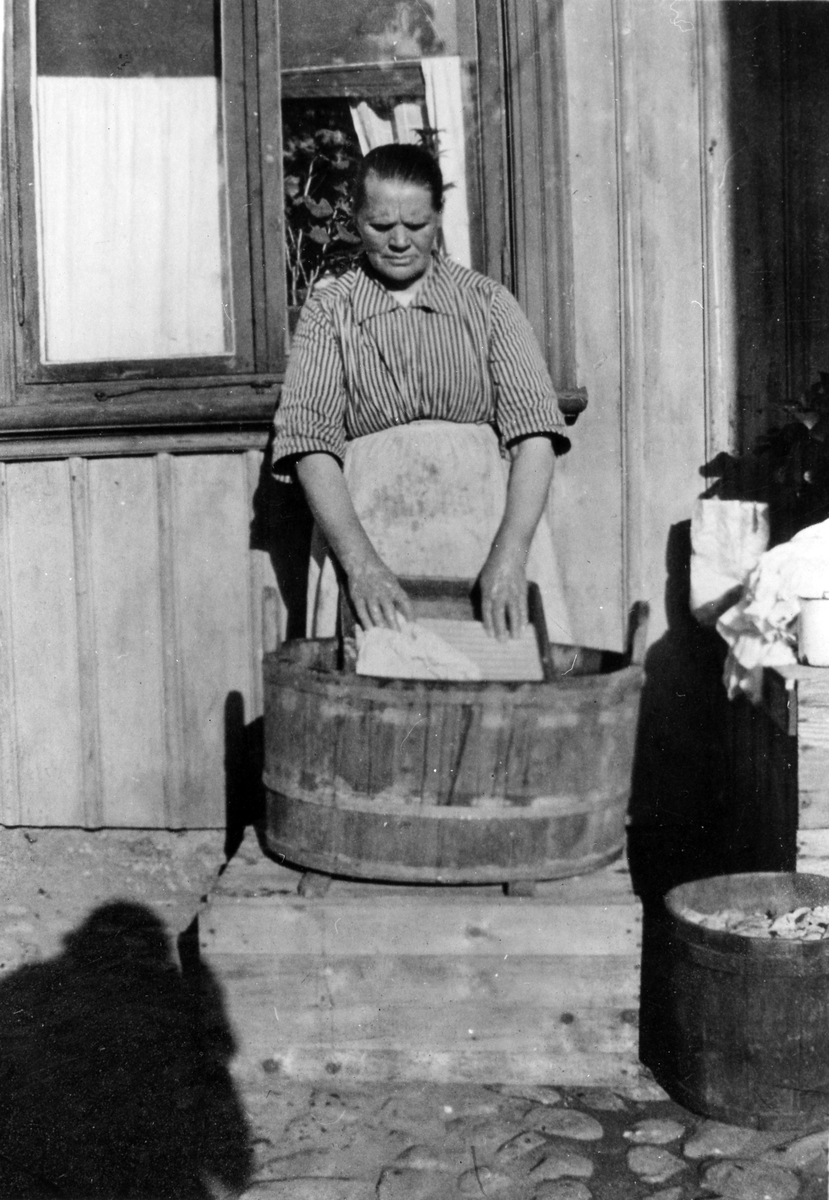 Amanda Dahlgren skrubbar tvätt i en tvättbalja på gården, Solgatan 7.