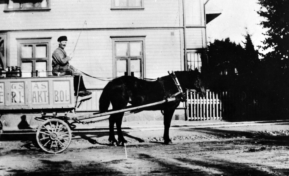 Gotthard Olsson, utkörare av pilsner från Alingsås bryggeri, sitter i bryggeriets vagn bakom en häst.