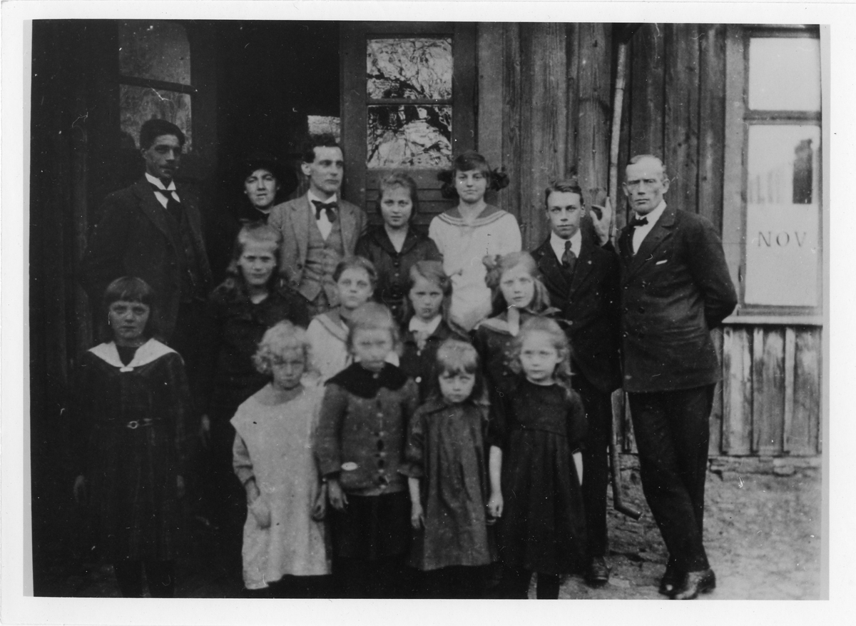 3 män och en grupp med 14 barn, pojkar och flickor, stående utanför en ingång där texten NOV syns på den högra fönsterrutan.
