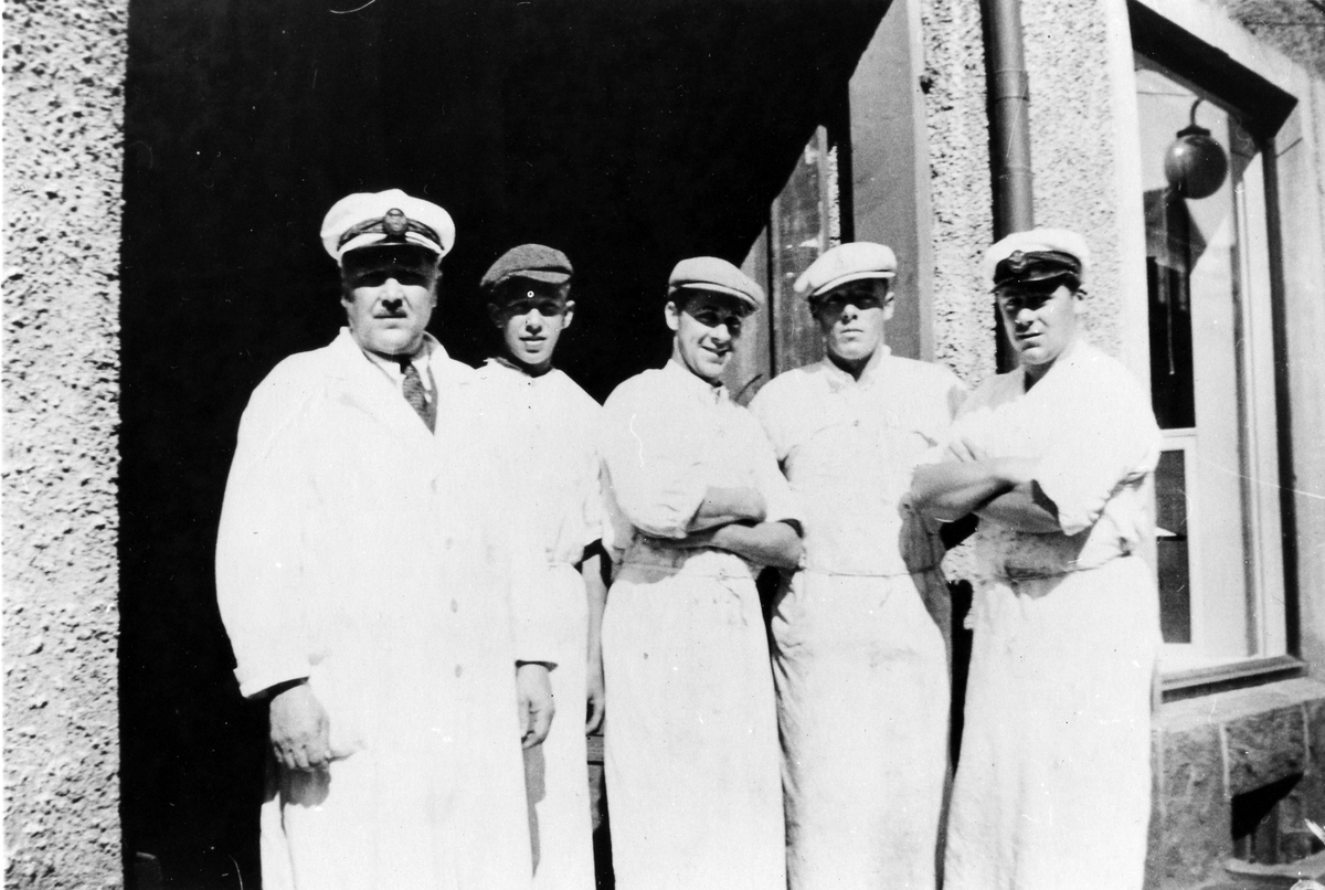 5 män i vita rockar och kepsar står utanför ingången till Skoglunds Charkuteri.