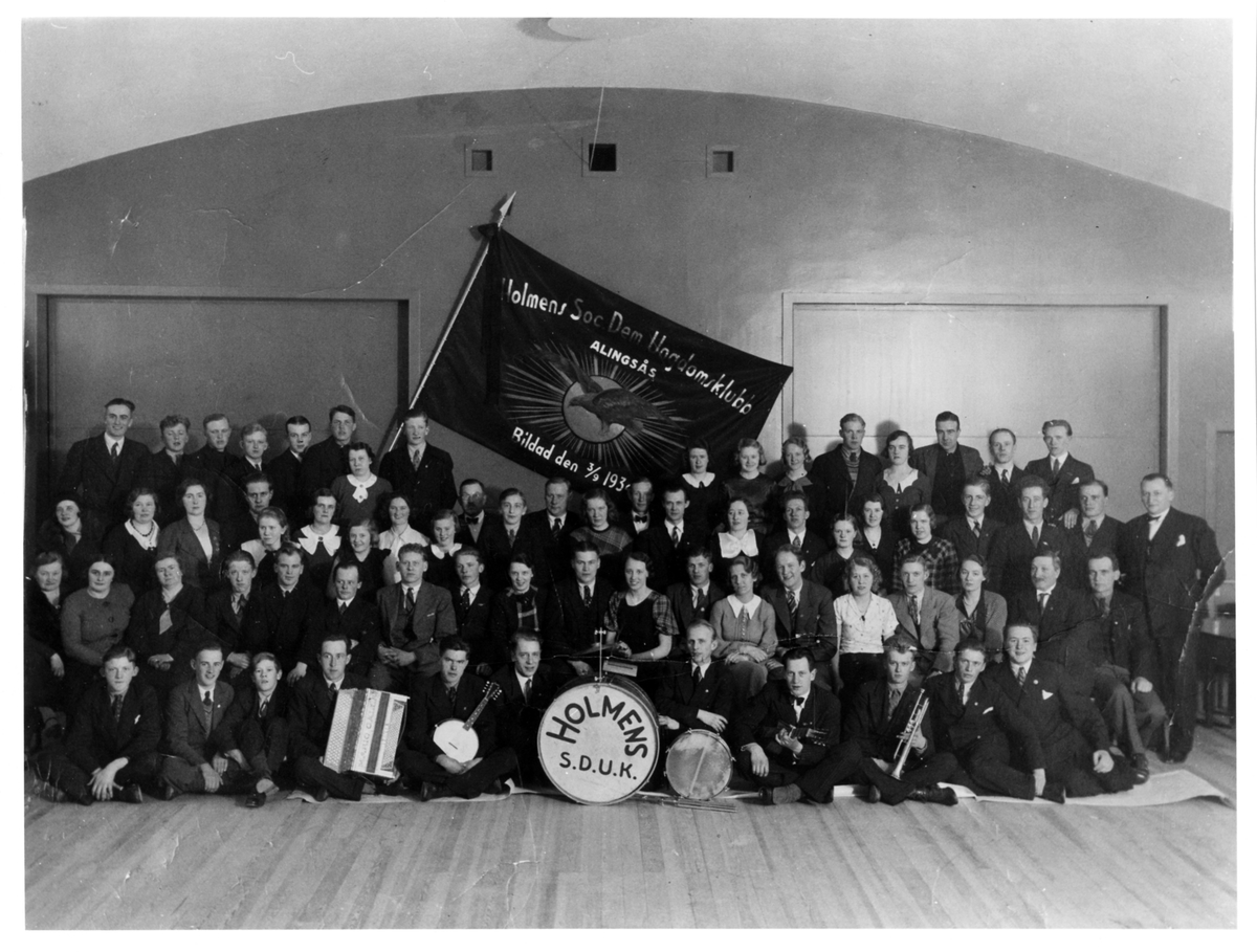 Gruppbild av ett 70-tal kvinnor och män med en stor flagga i bakgrunden med texten " Holmens Soc Dem Ungdomsklubb, Alingsås, Bildad den 3/9 1934". 6 av männen i främsta raden sitter med var sitt musikinstrument.