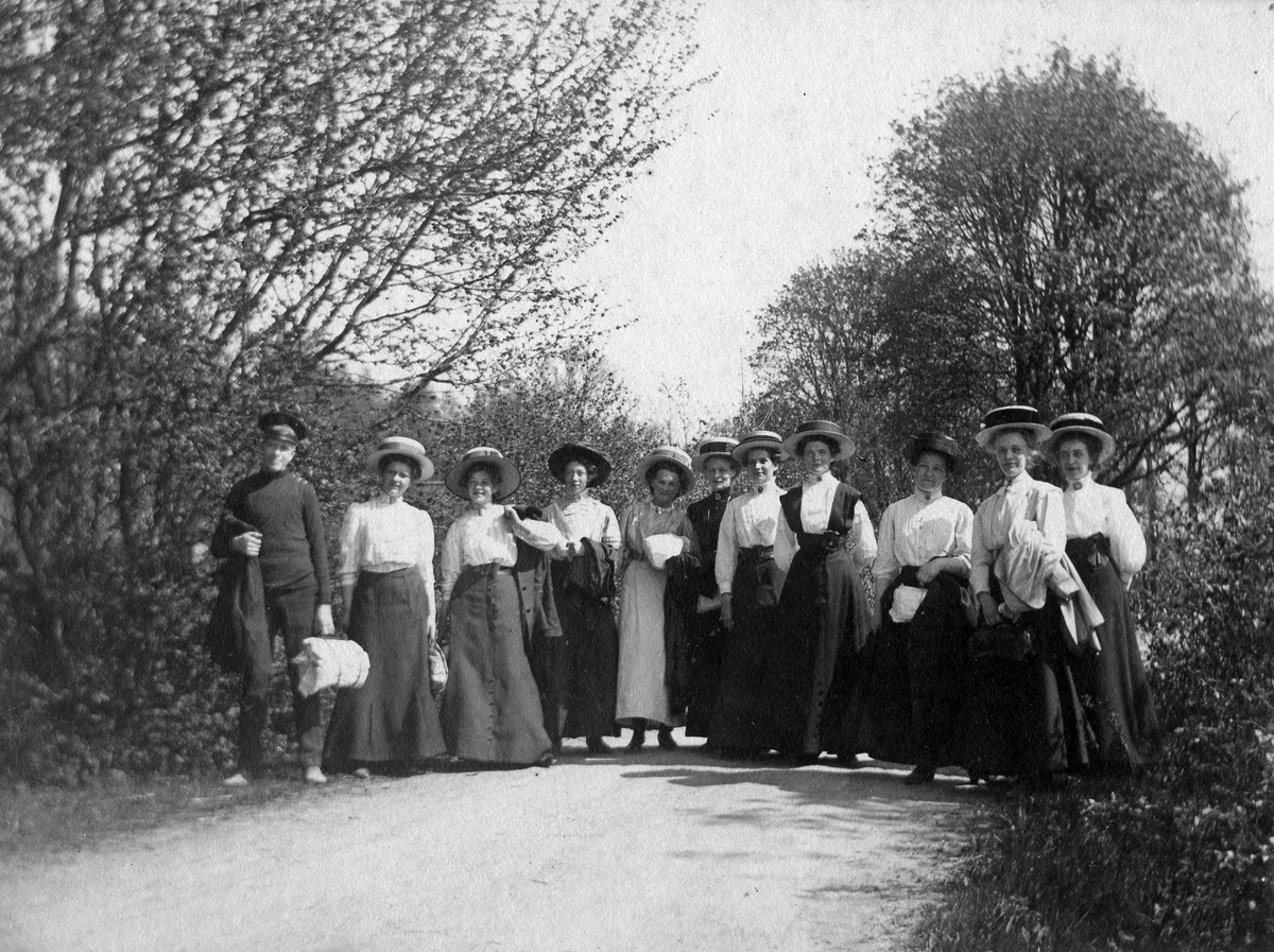 Frälsningsarmén ute på gökotta. 10 kvinnor, klädda i blus, långkjol och hatt, samt en man, i uniformskeps, står på en grusväg.