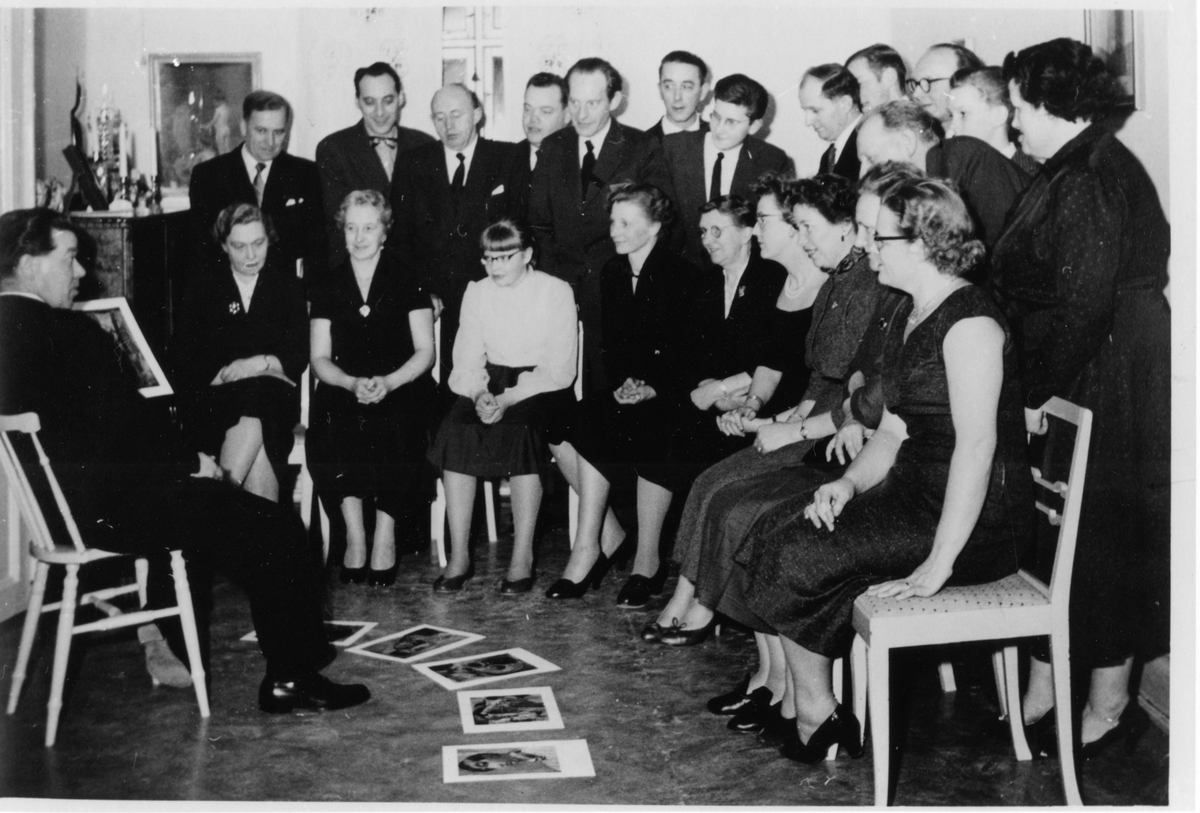 22 personer i halvcirkel framför en man som sitter på en stol. Framför sig, på golvet, ligger 5 bilder.
