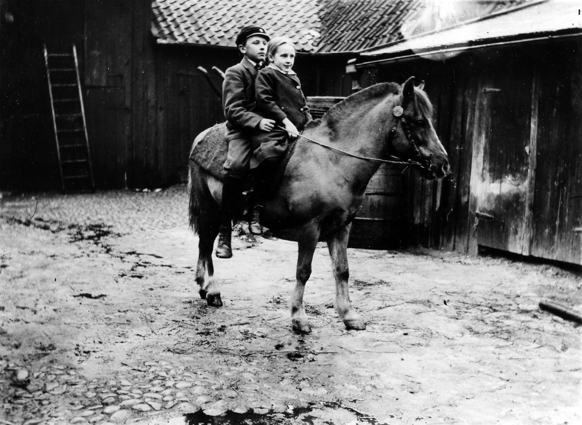 Brita och Elof Hjelmqvist sitter på hästen Tommy. Hästen var en av de sista av den nu utdöda rasen ölänning.