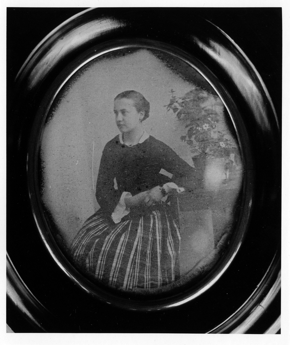 Portätt, daguerreotypi i oval form. En kvinna, i blus och randig kjol, sitter halvtvänt bort från kameran med en blomkruka bakom sig.