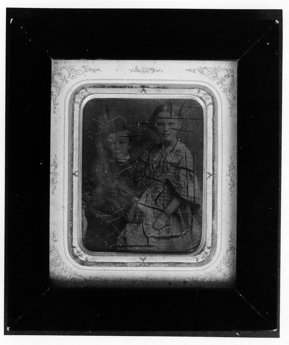 Porträtt, panotypi i rektangulär form med rundade hörn. Bilden visar två barn, en flicka, i rutig klänning, med en yngre pojke bredvid sig.