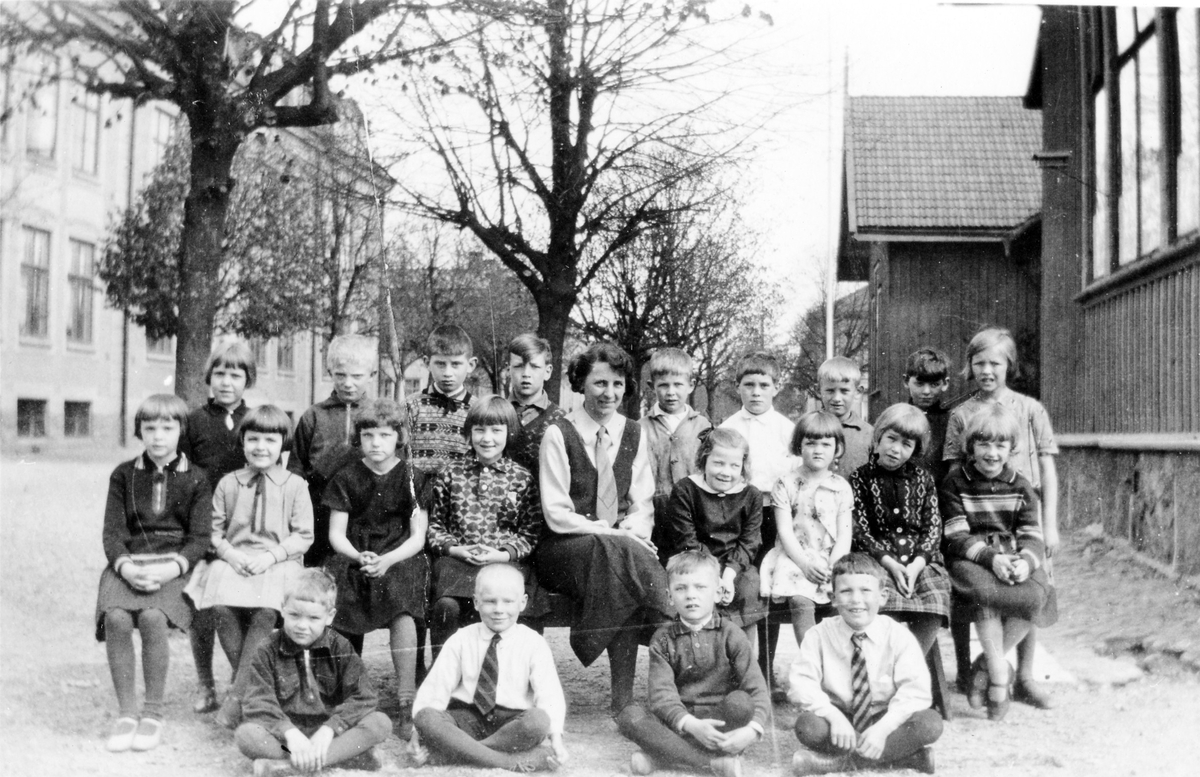 Lisa Alfredsson i småskolan, hon sitter till vänster om sin lärarinna.