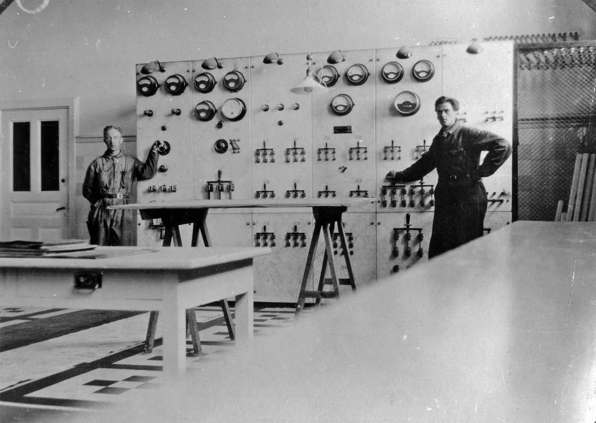 Två män står på var sin sida av en instrumentpanel med spakar och knappar mm. Möjligen tagen på elverket. På bildens baksida: "Minne av Elfrid Jelm den 26/3 1925"