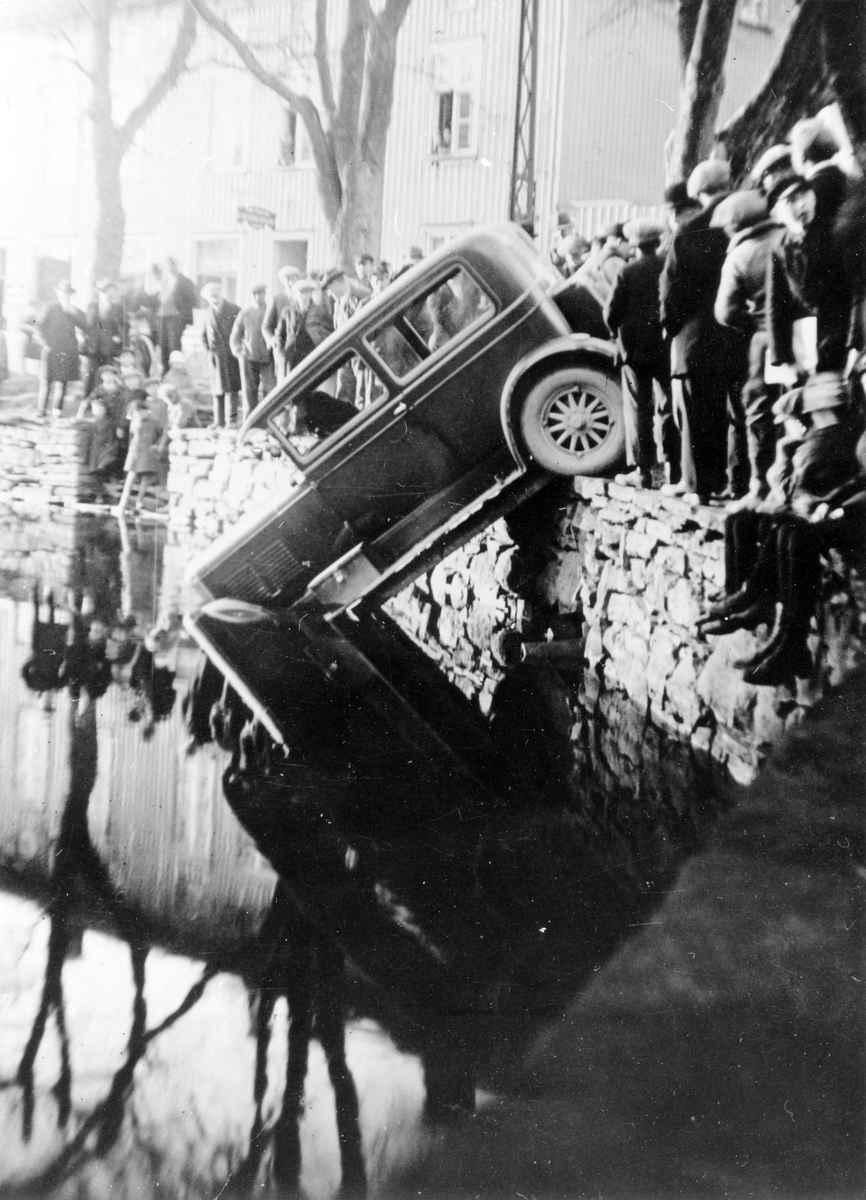 Bilden visar Doktor Ivan Bratts personbil som kört över kanten och står framstupa ner i Lillån. I förarsättet syns vad som liknar skuggan av en person. Runt kanten står och sitter åskådare.