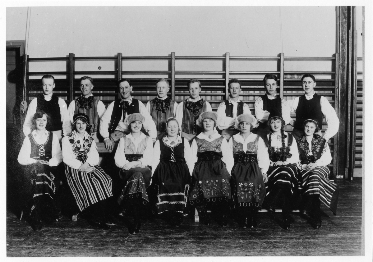 Gruppbild av Alingsås folkdanslag. Bilden är tagen i en gymnastiksal och föreställer 8 kvinnor (sittande) och 8 män (stående) klädda i olika folkdräkter.