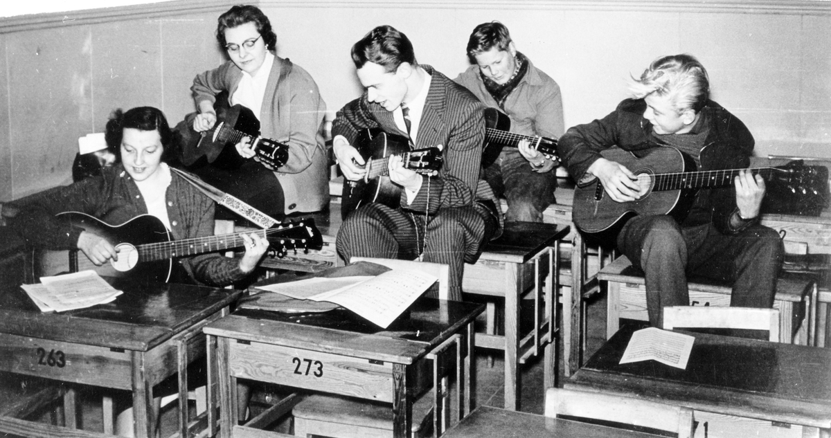 Kursverksamhet: Lindholms gitarrkurs. Fem personer sitter vid och på skolbänkar med varsin gitarr.