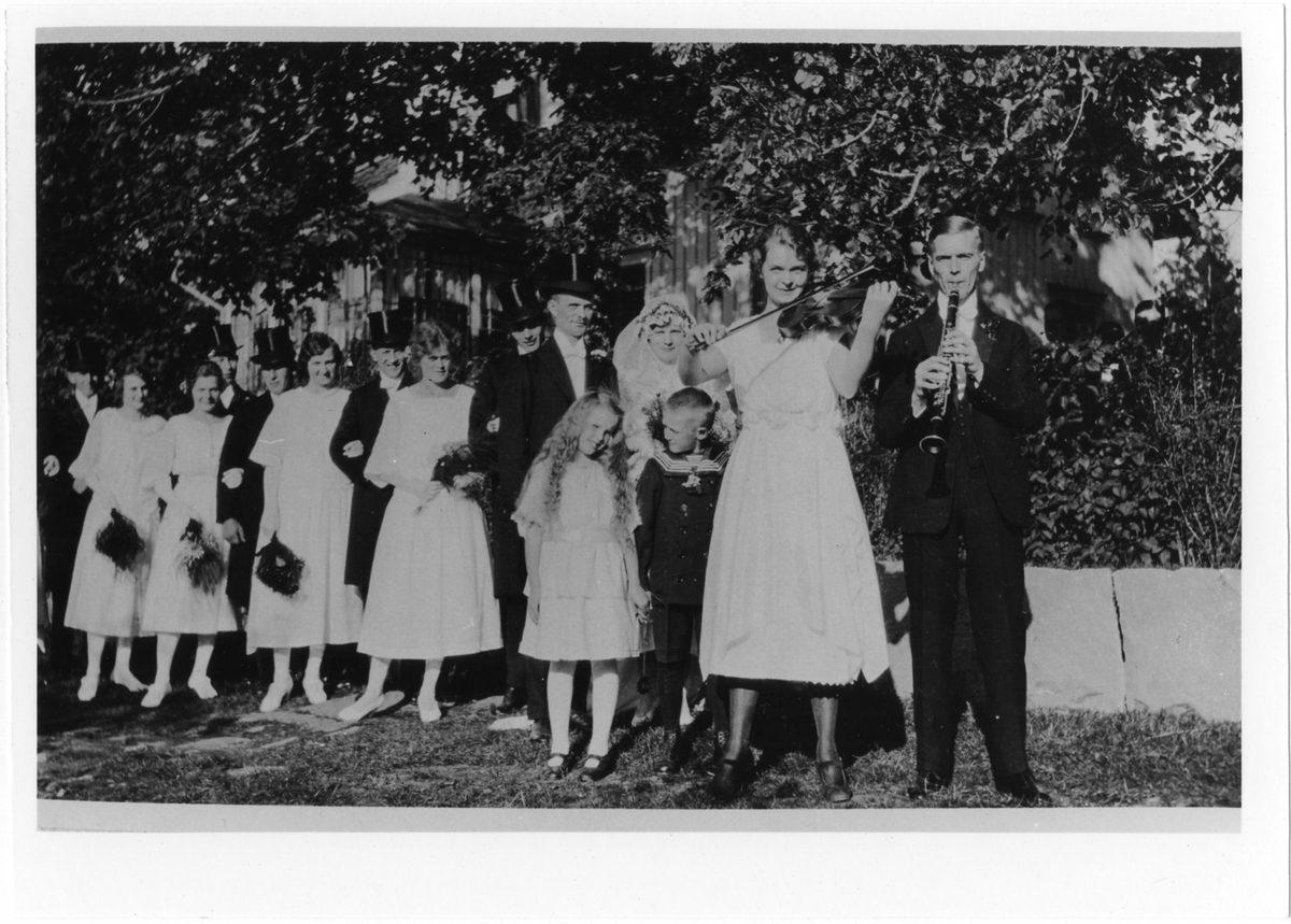 Ett bröllopsfölje i Västra Bodarna, med musikanter i spetsen och brudparet strax efter.