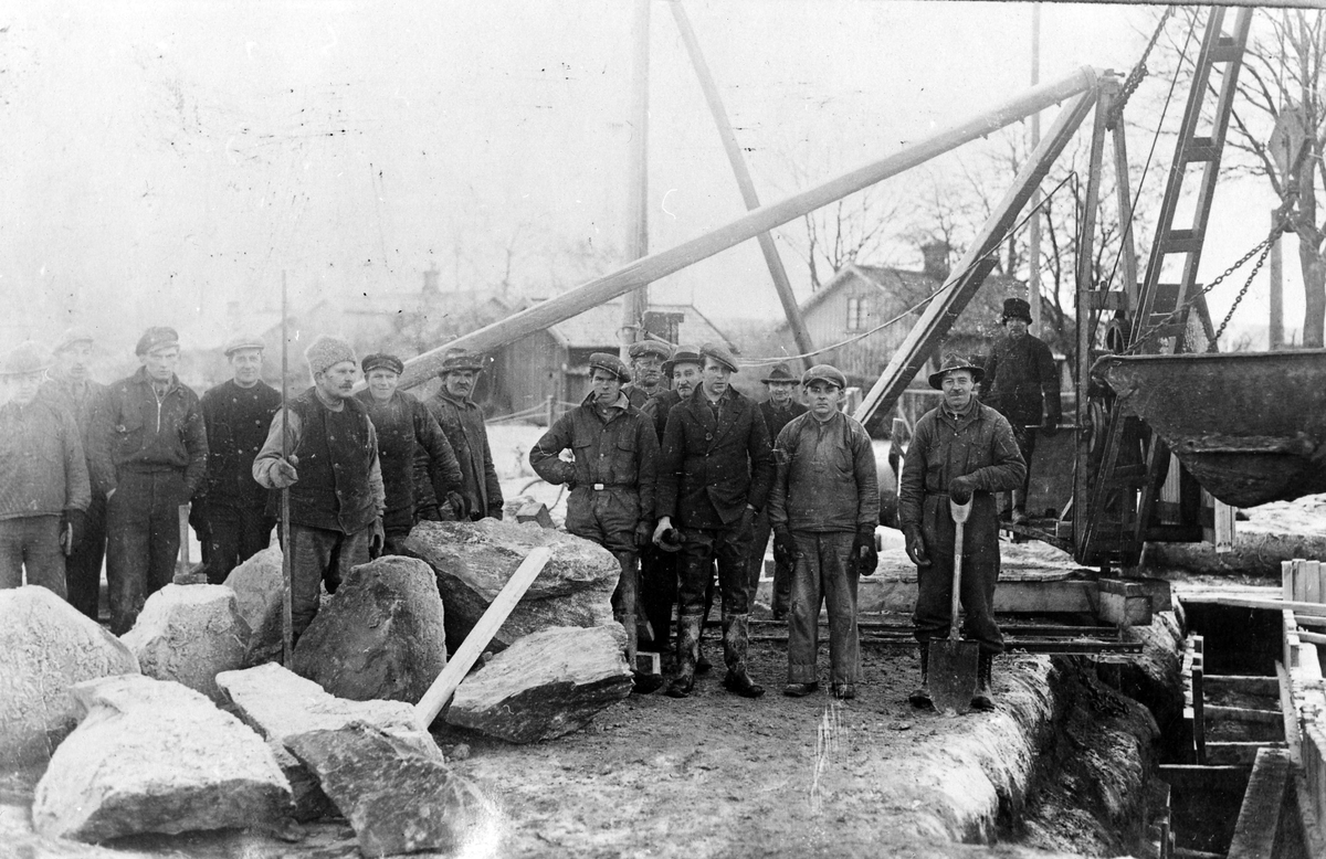 Femton arbetare står uppställda vid en gjutgrund framför en mindre lyftkran. Männen var nödhjälpsarbetare som arbetade 14-dagars pass. Fotografiet är taget utanför Oskar Nilssons affär på Hemvägen.