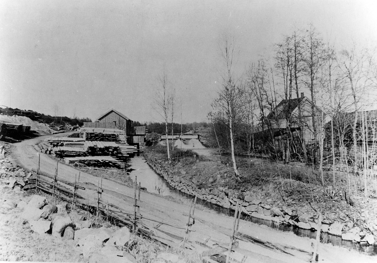 Ålanda kvarn. Främst ett staket framför en smal landsväg, bakom den flera stora högar med bräder, en å till höger samt hus bakom flera träd till höger.