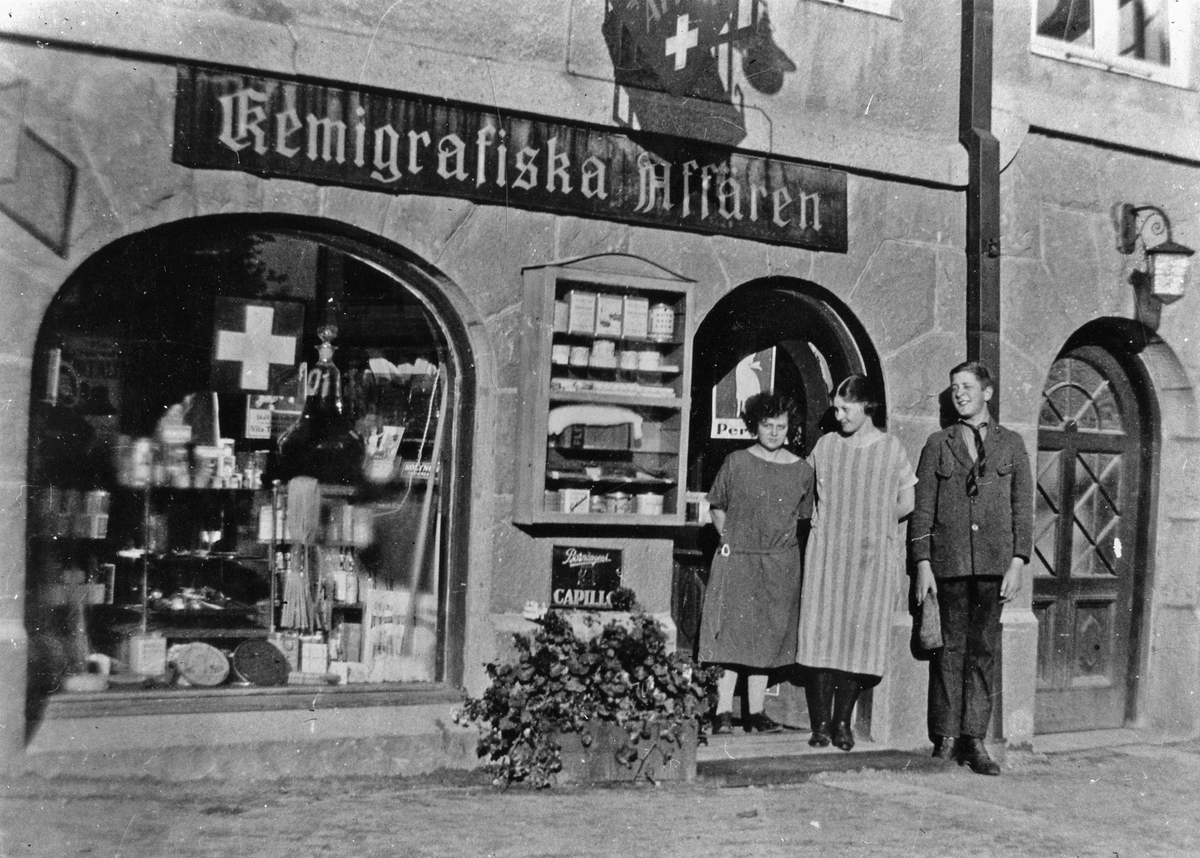 Signhild Skog, Gunhild Svantesson och Carl Ivar Landgren (här ca 15år) står utanför Kemigrafiska Affären på Göteborgsvägen. Kvarteret Cederberg 3. Knut Landgrens Kemikalieaffär, blev sedemera Landgrens Färg och Parfymeri, 1922-1984-04-01. Efter det låg Bäcks Hår och Parfym, i samma lokaler, Magasinsgatan 1.