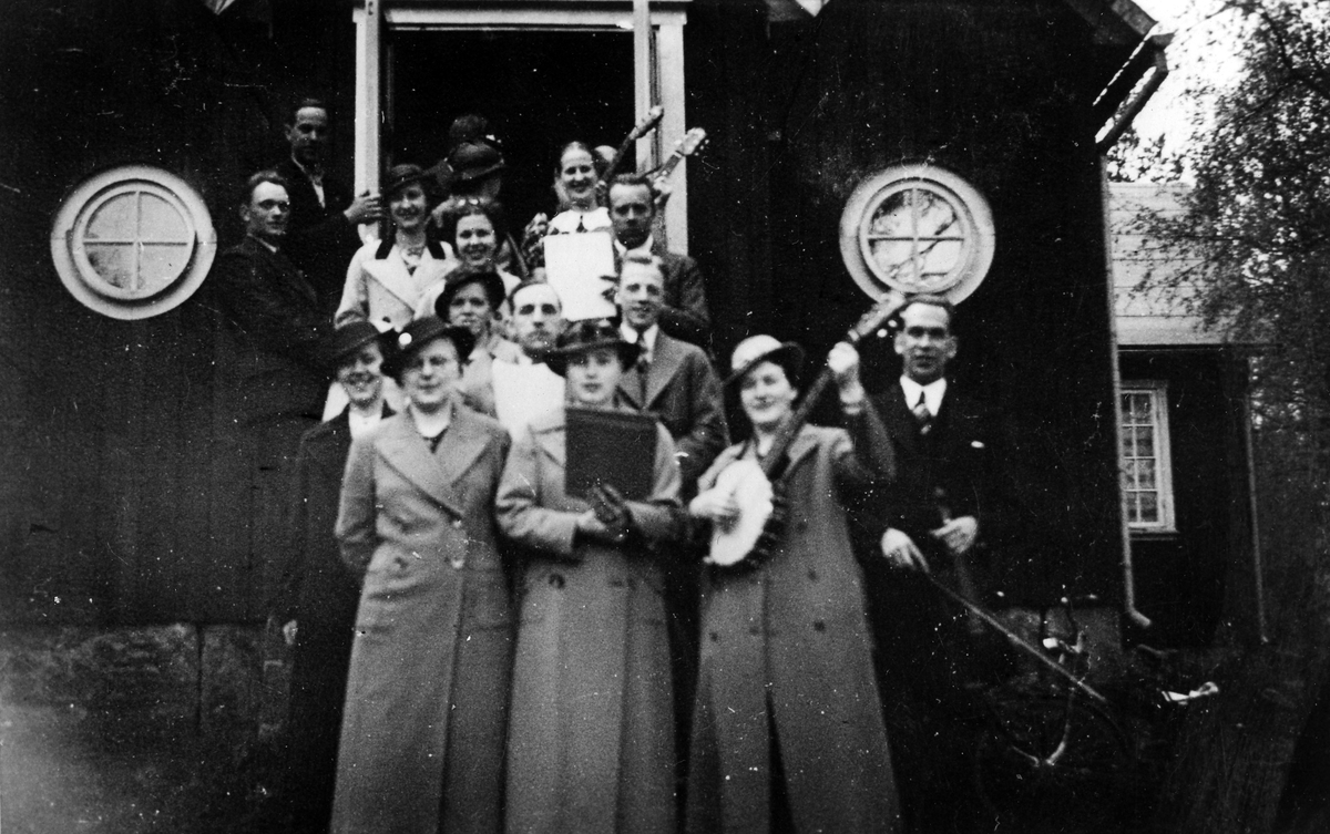 Gruppbild med ett gäng kvinnor och män som står på trappan till ett kapell. Vissa håller i musikinstrument och andra i not/textblad. På fotografiet står antecknat: Kristi H.f.d (Kristi himmelsfärdsdagen) Betania, Högklint 1937.