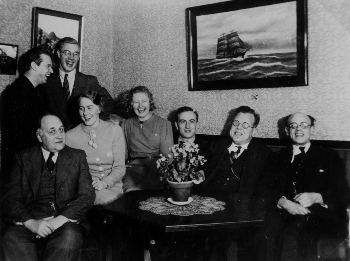Gruppbild av 6 män och 2 kvinnor som skrattande trängs på en soffa. På väggen bakom dom hänger tavlor, där ena har motiv av ett skepp till havs.