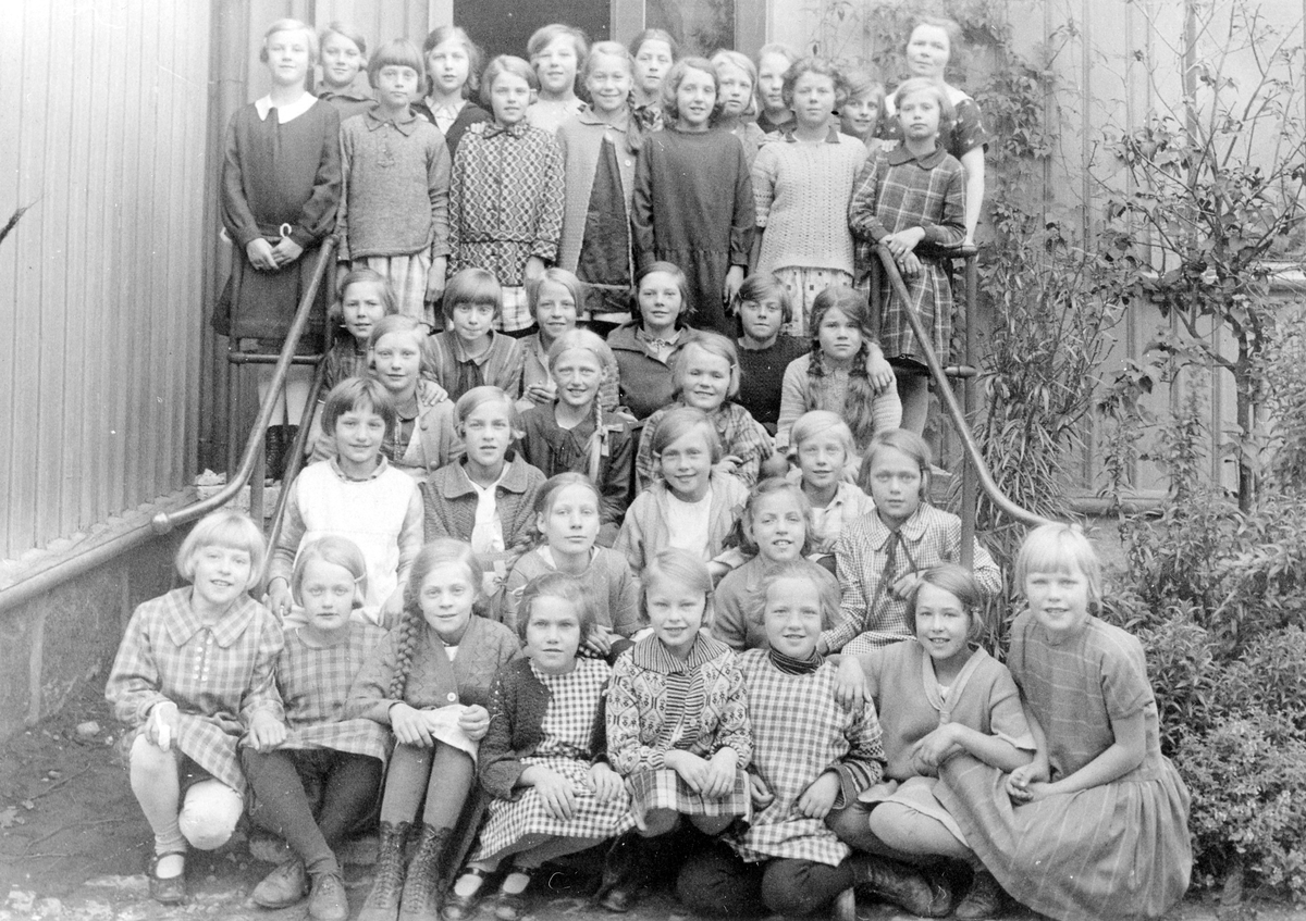 En skolklass på cirka fyrtio elever med sin lärarinna står på en trappa, Centralskolan.