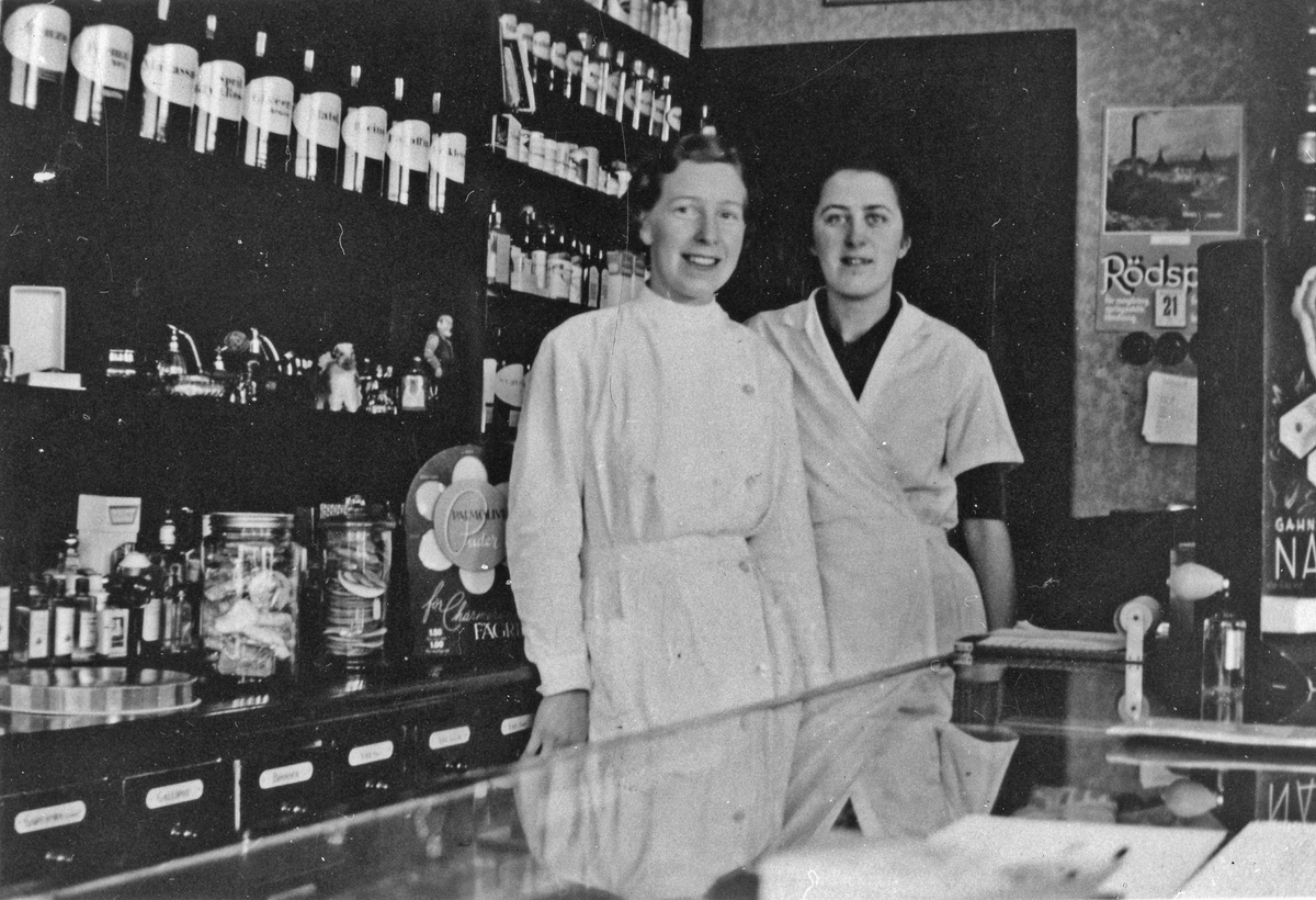 2 kvinnor, Kerstin Landgren och Elsa Landgren, i vita rockar står bakom en butiksdisk och tittar in i kameran. Bakom sig har dom en hylla fylld med glasburkar.