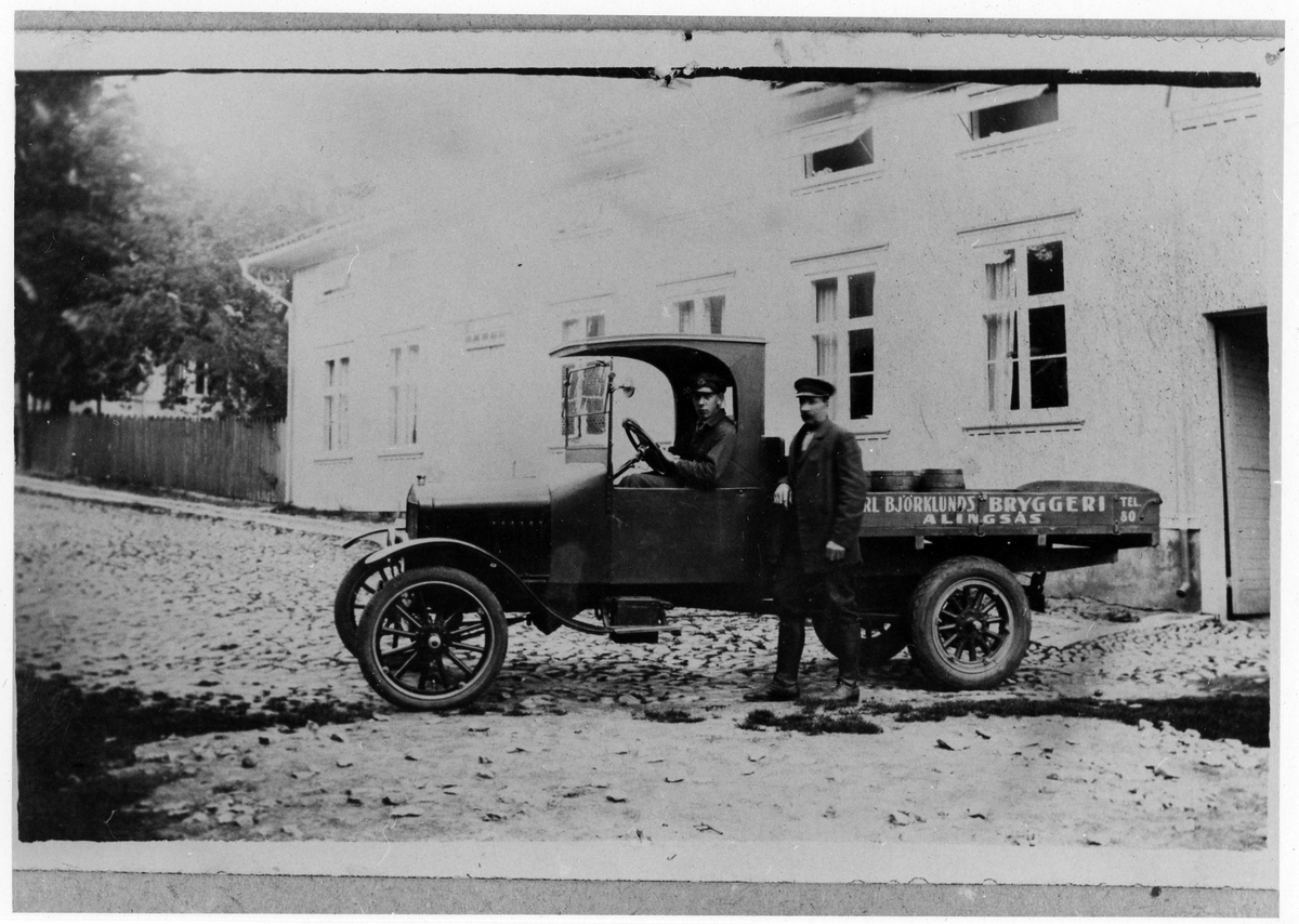En bild på två män och en lastbil från Carl Björklunds bryggeri. Bilden troligen tagen utanför bryggeriet.