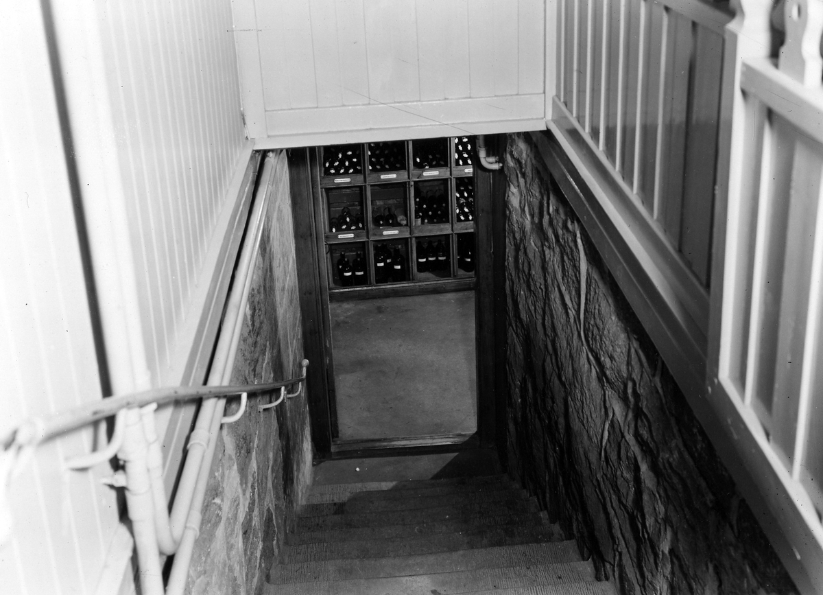 Nedgången till vattenkällaren på apoteket Hjorten. Bilden visar en trappnedgång, i dörröppningen syns hyllor med flaskor på.