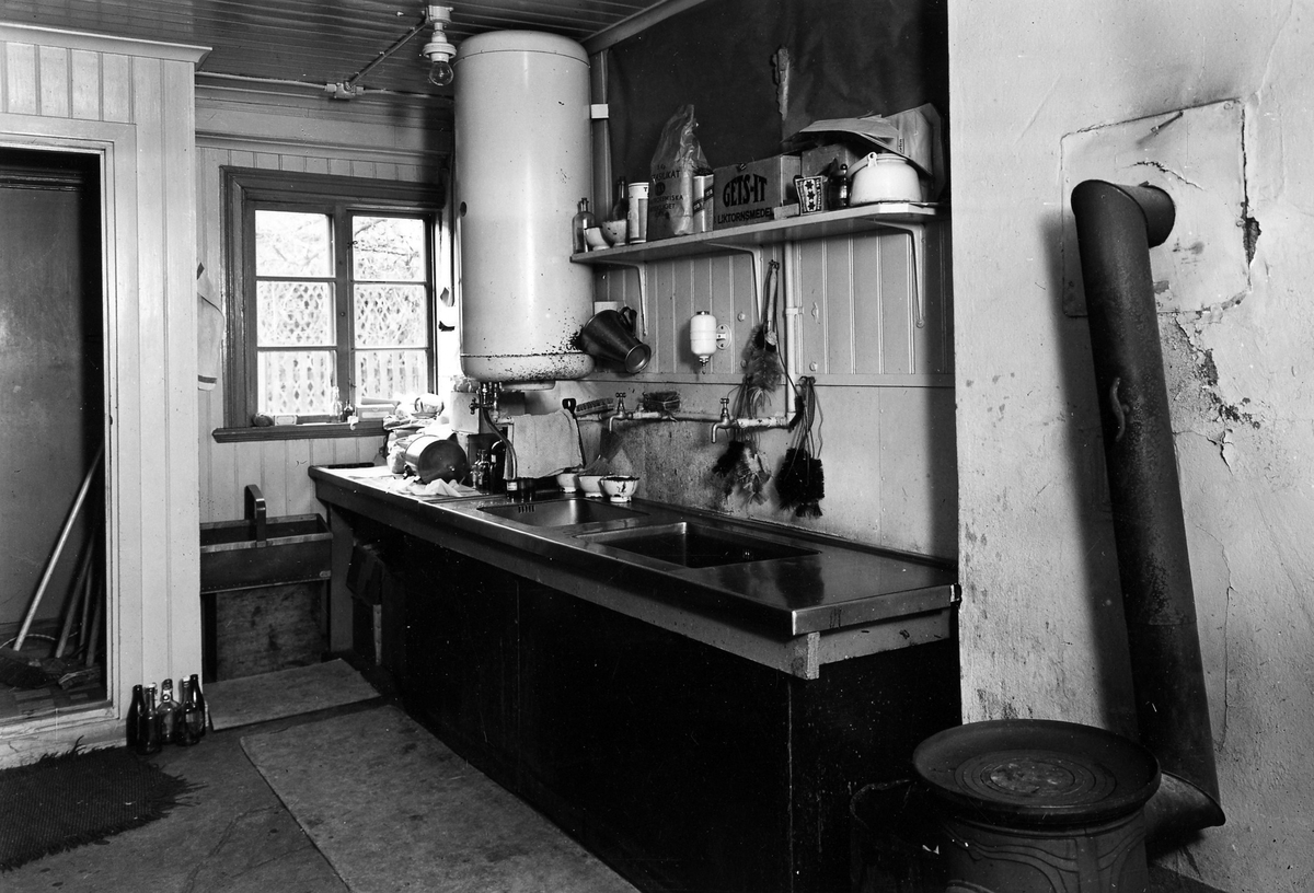 Sköljboden på apoteket Hjorten. Bilden visar en vägg med vask, vattentank och en gjutjärnsspis.