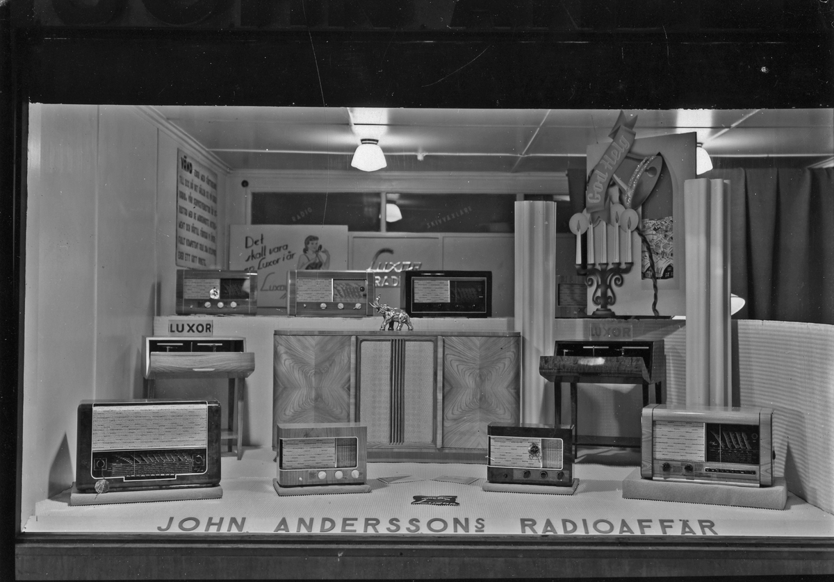 Exteriörbild på skyltfönster med radioappareter i John Anderssons Radioaffär. Nuvarande Radiocentrum