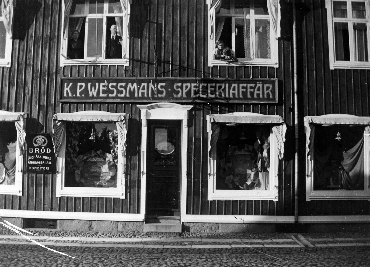 Gatuvy av K.P. Wessmans speceriaffär. Trähus med två synliga plan, fönster med persienner och två skyltar. En lång skylt som sträcker sig över dörren och de två intilligande fönstren samt en skylt mellan de två vänstra fönstren. I det vänstra fönstret på ovanvåningen syns en man och en kvinna och i fönstret till höger två barn, förmodligen familjen Wessman.