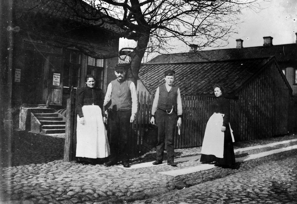 2 kvinnor, i ljust förkläde, och 2 män, i väst och keps, står på kullerstensgatan utanför Nils Sandbergs Mjöl Gryn och Spannmålsaffär på Nygatan i Kv Pärlan 6, tomt 74. Bredvid affären låg Brännvinsbolaget. I fastigheten bodde också barnmorskan Anna Bäckström.