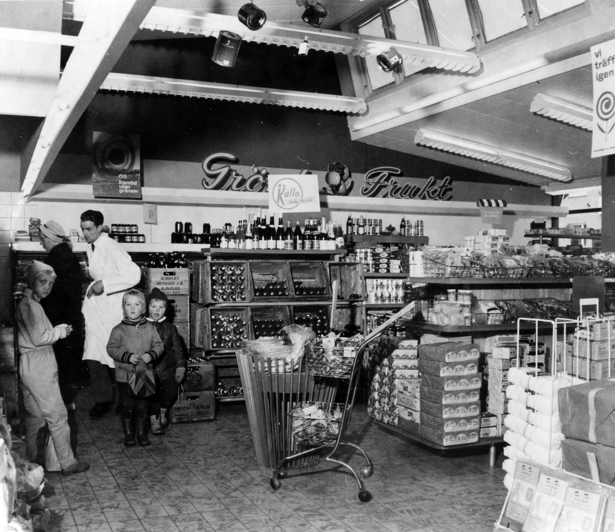 Konsumbutiken på Sjömansvägen i Stockslycke. Tre pojkar och en kvinna vid avdelningen för bröd och läsk.