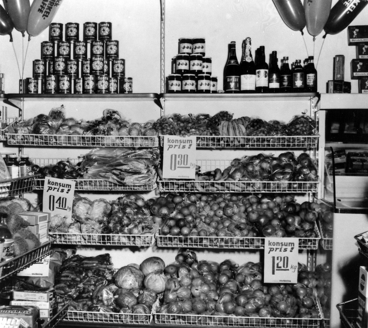 Butiksinteriör på Konsum Viktoriagatan. Hyllor med konserver, frukter och grönsaker.