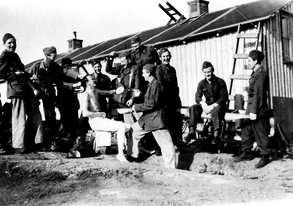 Bilder visar 11 skrattande/skojande män klädda i uniform som står/sitter i en halvcirkel runt en man i bar överkropp som sitter på en pall.