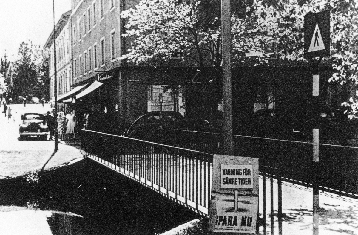 Gatuvy av Ljungblads konditori, främst på bilden en reklamskylt om sparande "Varning för sämre tider - Spara nu".