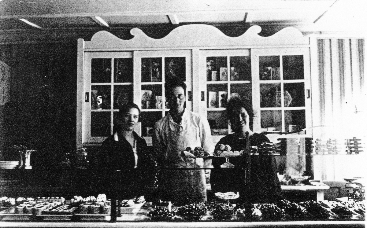 Bild tagen inifrån Ljungblads konditori. Bakom disken, med ett stort urval av konfektyrer, står 2 kvinnor och 1 man.