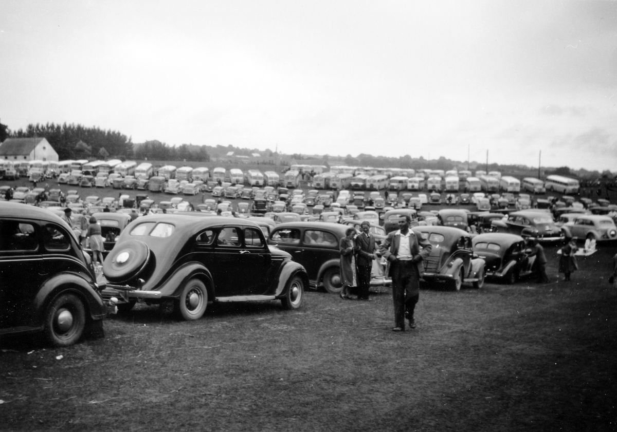 Stort antal bilar och bussar står parkerade på ett öppet fält. Färmst på bilden ses en gående man med vit skjorta och bakom honom ett par som håller armkrok.